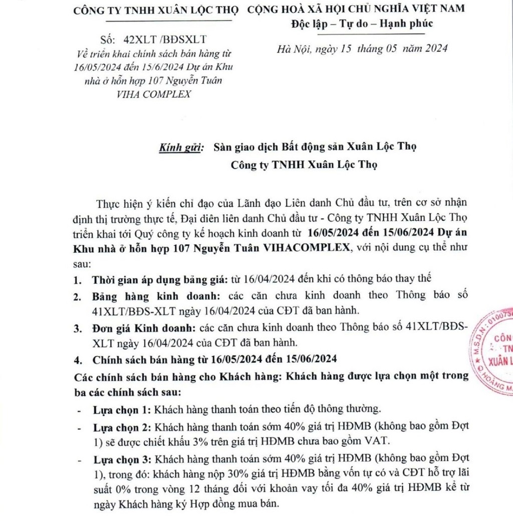 ✅ Chính sách bán hàng và hỗ trợ tài chính vượt trội: Với nhiều chính sách bán hàng linh hoạt và các giải pháp hỗ trợ về vốn từ ngân hàng, như hỗ trợ lãi suất 0%, ân hạn nợ gốc, chủ đầu tư VIHA COMPLEX 107 Nguyễn Tuân đã tạo điều kiện vô cùng thuận lợi để khách hàng có thể dễ dàng sở hữu căn hộ mơ ước mà không phải chịu nhiều áp lực tài chính.